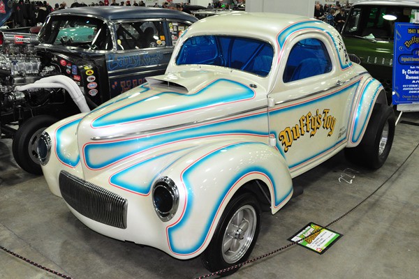+ A period-perfect 1941 Willys gasser straight out of 1968, complete with psychedelic paint, blue plexi windows, and injected Big-Block Chevy, now owned by Richard Malmsten.