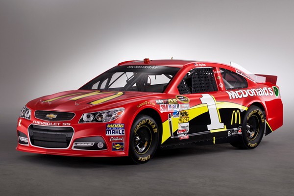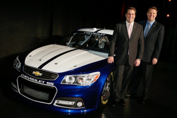 Chevy styled the NASCAR racer after the 2014 Chevrolet SS, a rear-drive V8 performance sedan that shares its platform with the VF Commodore from GM’s Holden division in Australia. The production SS will appear in Chevrolet showrooms in North America in late 2013.