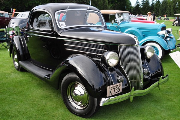 + Gary T. Ridell’s 1936 Ford Three-Window Coupe, also seen at the St. John’s Preview. As black and as straight as any flathead V8-era Ford you will ever see.