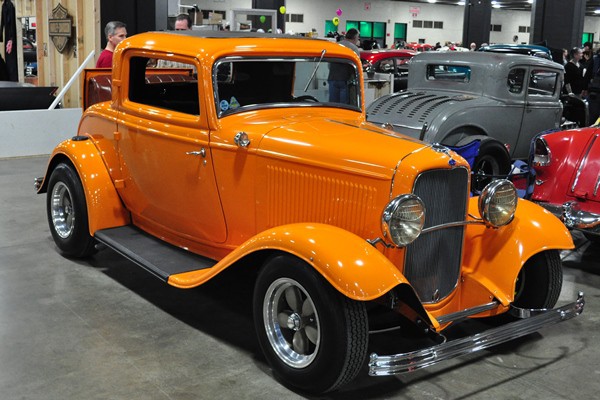 + Joe Ramsey’s ’32 Ford Deluxe Coupe: competition orange, daisy-spoke American Racing 200S wheels, looking like it just drove in out of a 1968 issue of Rod & Custom.