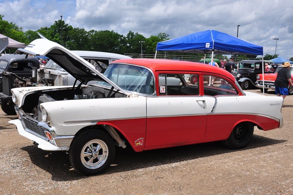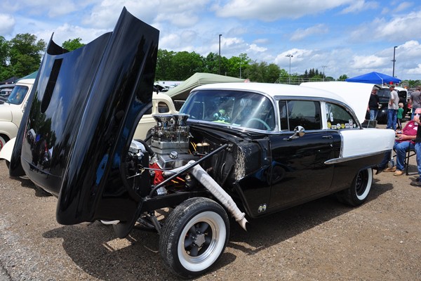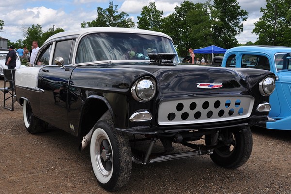+ A ’55 Chevy gasser powered by a small-block Chevy with an Edelbrock TR-1 intake manifold, the original shoebox tunnel-ram.