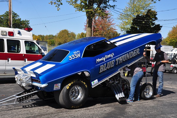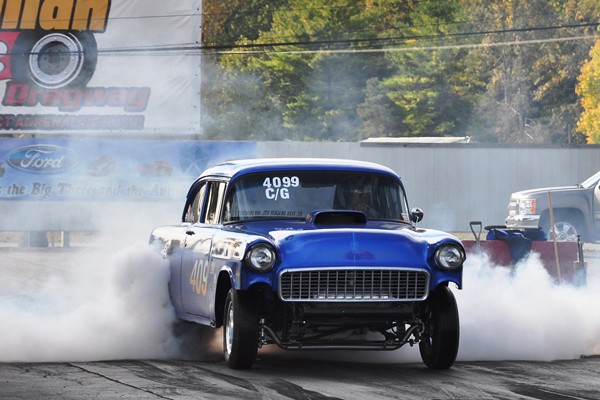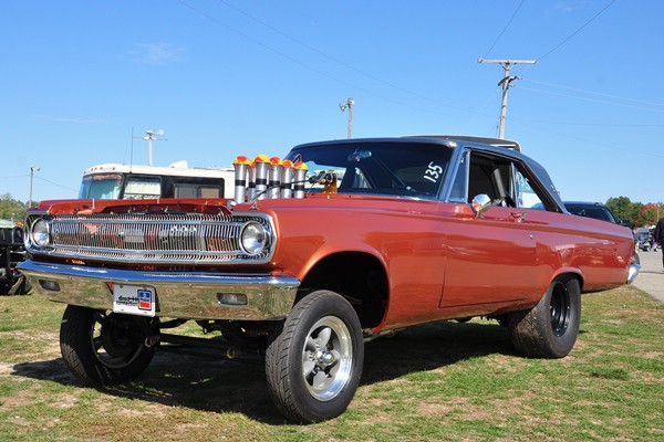 + Tom Nowicki’s Haulin’ Ass ’56 Chevy gasser, which uses a 6-71 blown small-block with carburetors to carry the front wheels three feet in the air