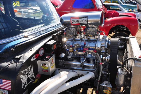 + A beautiful front-engine dragster sporting a Roots-blown Ford flathead and swoopy chute-fairing body.