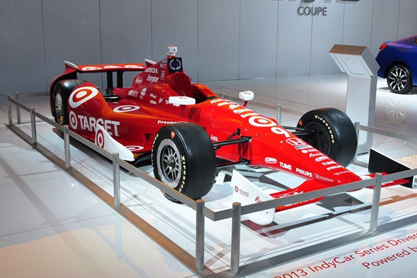 + Three Indy racers—two Dallara-Chevrolets in the GM exhibit and a Honda-powered Dallara in the Honda space. The current-generation Dallara with with its broad rear haunches is no great beauty, we have to admit, but it’s better looking in person than on television.