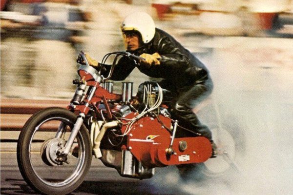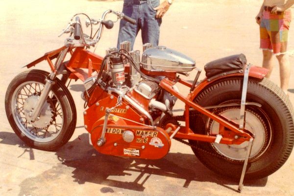EJ built a total of seven Chevy-powered bikes, the first three known as Bloody Mary and the last four also raced under the Widowmaker name. They were refined over the years but all employed the same basic schtick: EJ started the engine with the rear wheel propped up on an axle stand. With the revs up around 5000 to 6000 rpm or so, he rocked the bike off the stand, smoking the rear tire the length of the track, steering with the throttle, and crossing the finish line at 155 to 160 mph. Fans couldn’t get enough of the colorful act. Those who saw it won’t forget it.