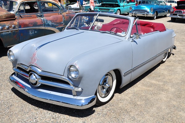 + A 1949 Ford convertible in primer gray with frenched headlamps, Lancer wheelcovers, and perfect ’50s taildragger stance.