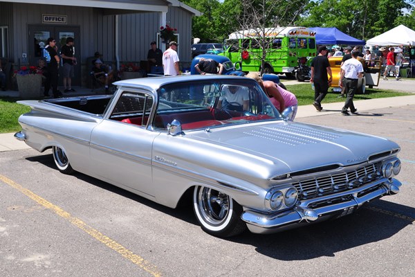 + A 1959 Chevrolet El Camino, lowered and louvered, with spotlights and silver lacquer.