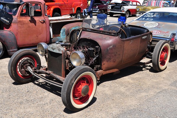 + An early ’20s Ford Model T turtle-deck roadster, stripped down to running weight with its fenders and running boards removed.