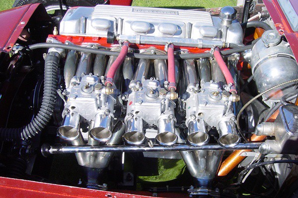 “I had been at Carroll Shelby’s new factory by the L.A. airport earlier on, and had spied some sidedraft Weber carbs. They had been sent by mistake from England; the original order was for downdrafts for the new Shelby Mustangs and planned Cobras. He donated three of them to the project, and a buddy in Studio City built up tubing intake and exhaust. ”