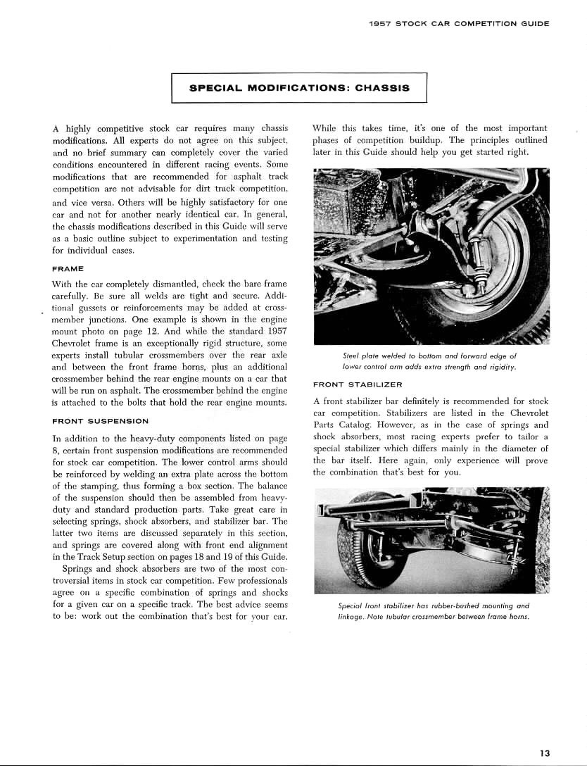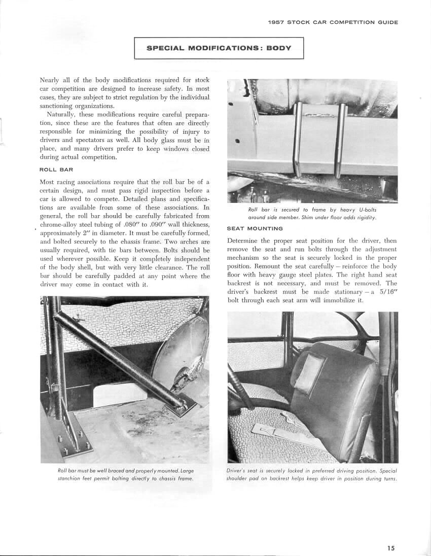 As such, the book is essentially an assembly manual for the famed ’57 Chevy Black Widow NASCAR racer, as driven by Buck Baker, Jack Smith, and others. It’s all here: heavy-duty part numbers, safety equipment installation, chassis and engine modifications. The material is fascinating, showing just how it was done in 1957, from roll bar construction to fuel injection tuning. Want to see the method used to bolt the doors shut? See page 16. Lower control arm reinforcement? Page 13. This is great stuff.
