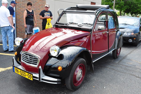 + Parked along the avenue just north of 13 Mile, a beautifully restored Citroen 2CV in maroon and black.